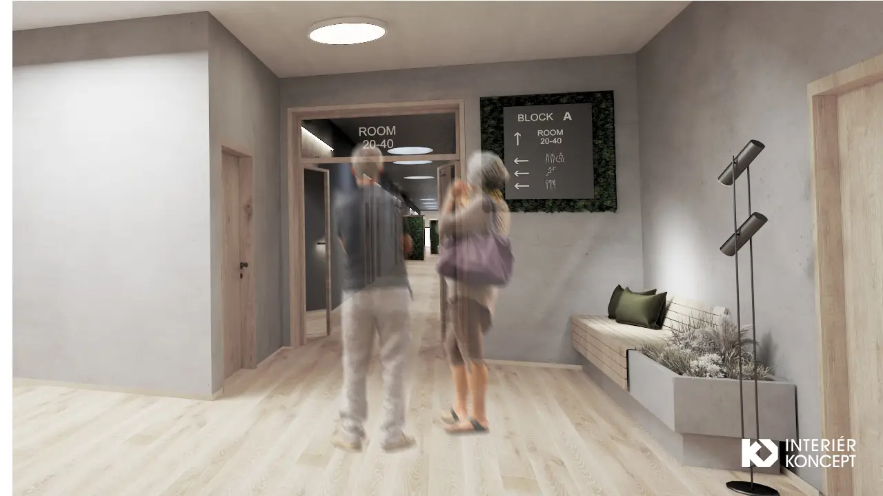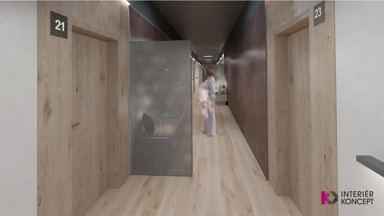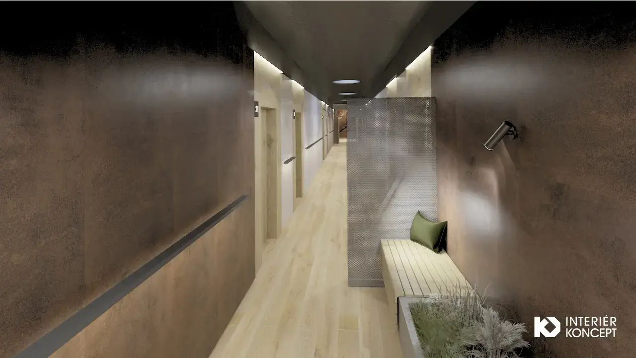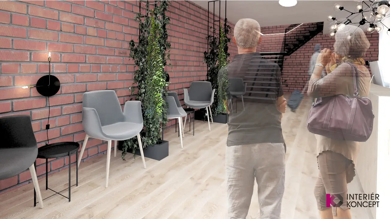Spojovací chodba připomínající úzký obdélník dostala novou funkci – kuchyňku, zázemí pro občerstvení. Chodba se zadním místností byla propojena kobercem pro zjednodušení členitého prostoru. Celý prostor s kuchyňkou s nízkým stropem jsme opticky zvýšili stropním osvětlením.