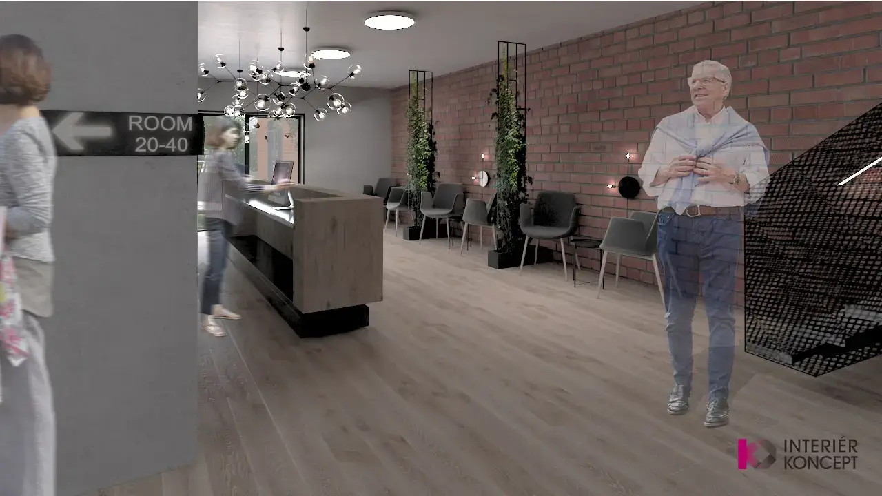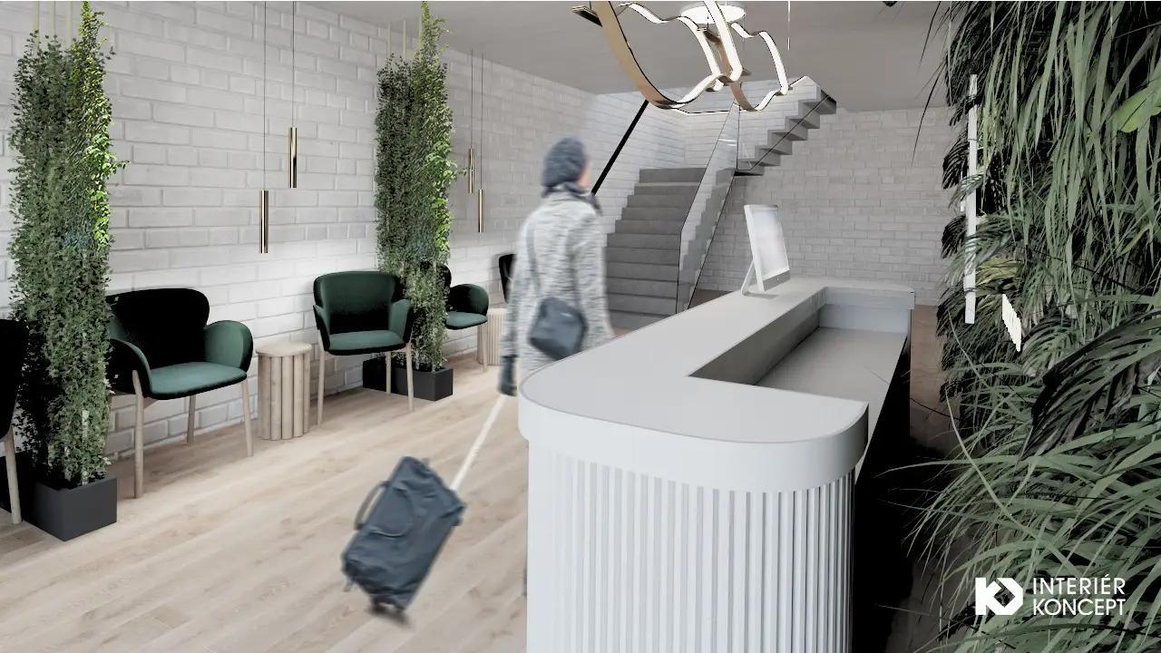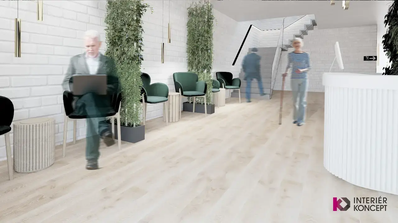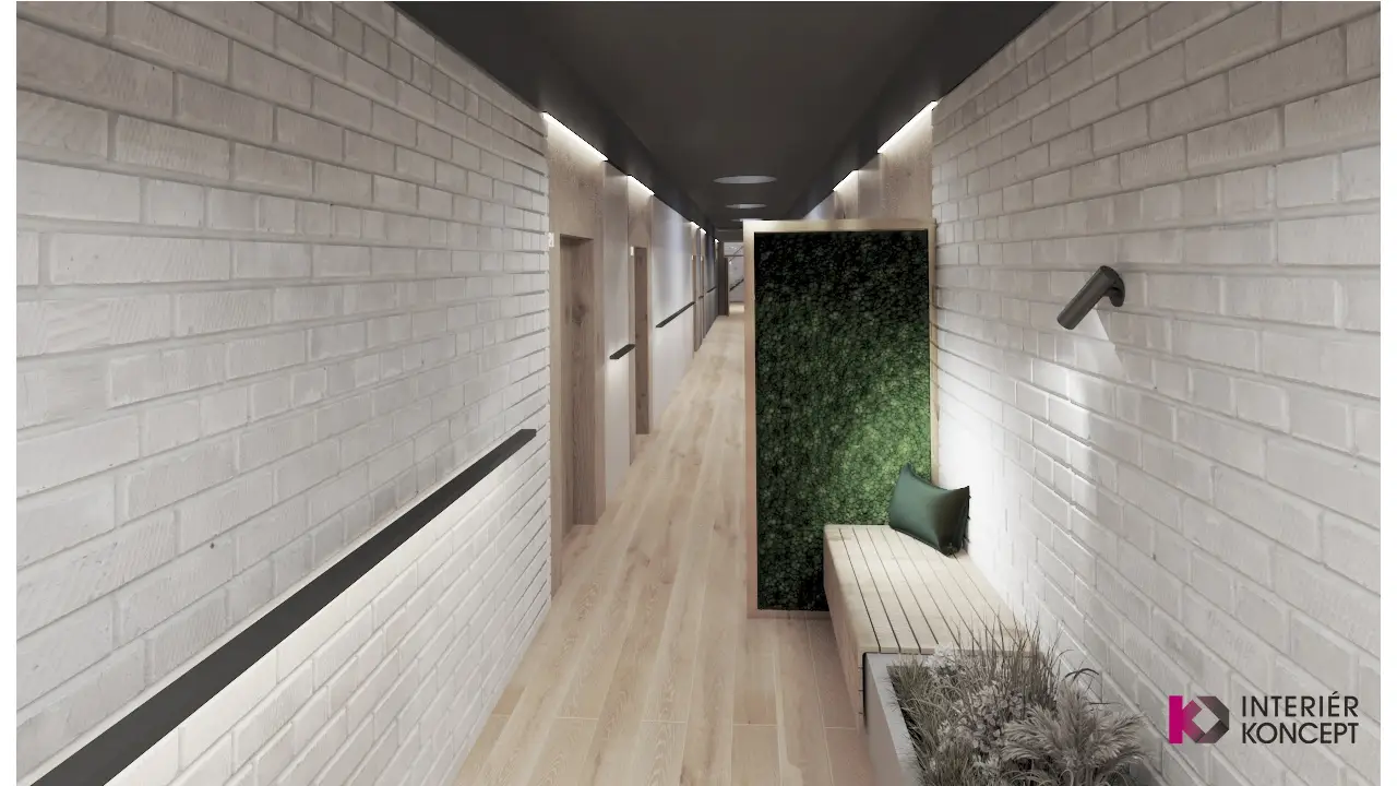 Spojovací chodba připomínající úzký obdélník dostala novou funkci – kuchyňku, zázemí pro občerstvení. Chodba se zadním místností byla propojena kobercem pro zjednodušení členitého prostoru. Celý prostor s kuchyňkou s nízkým stropem jsme opticky zvýšili stropním osvětlením.