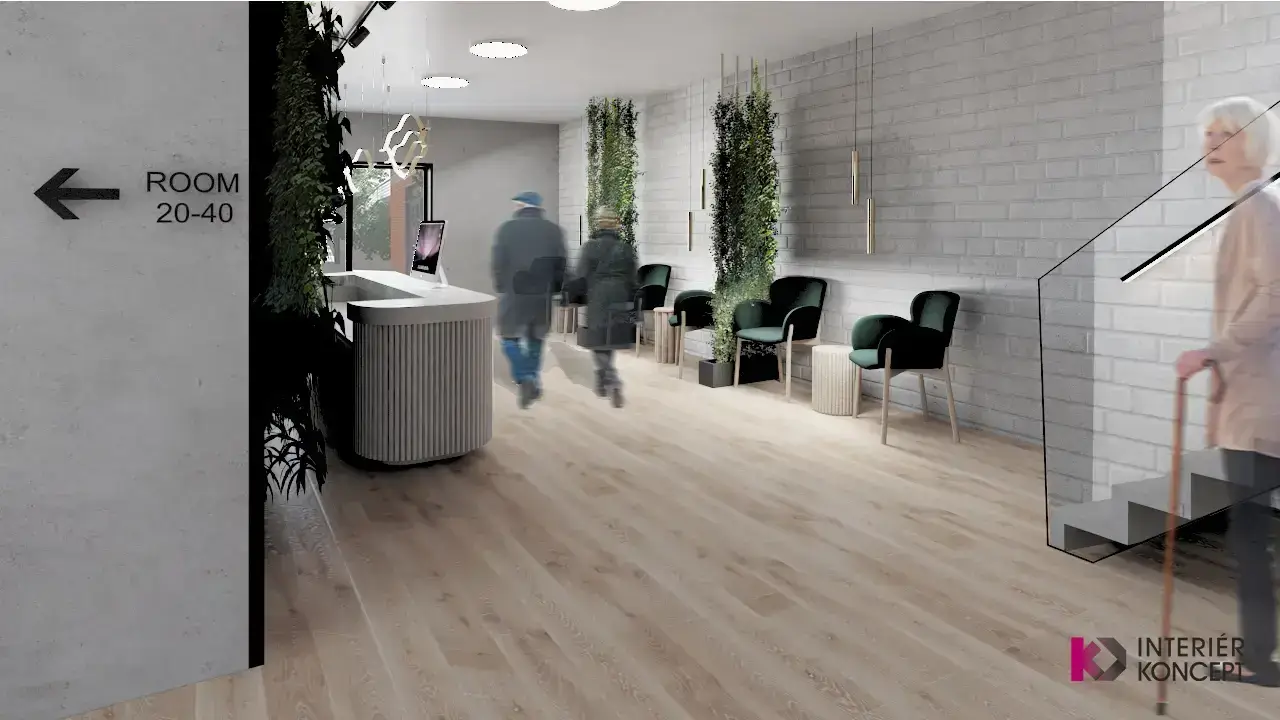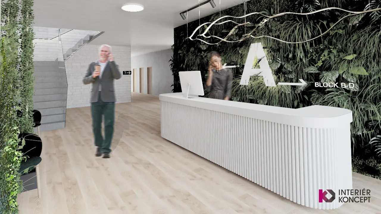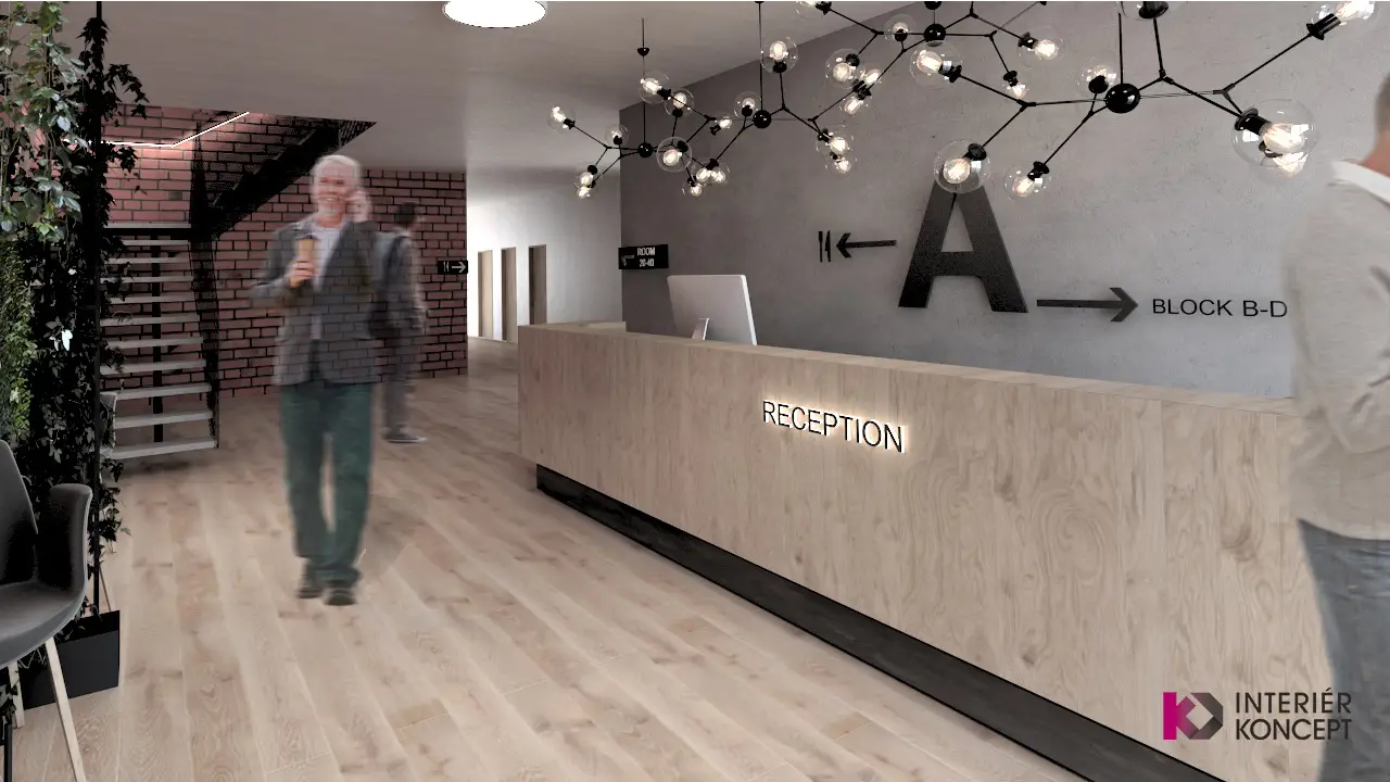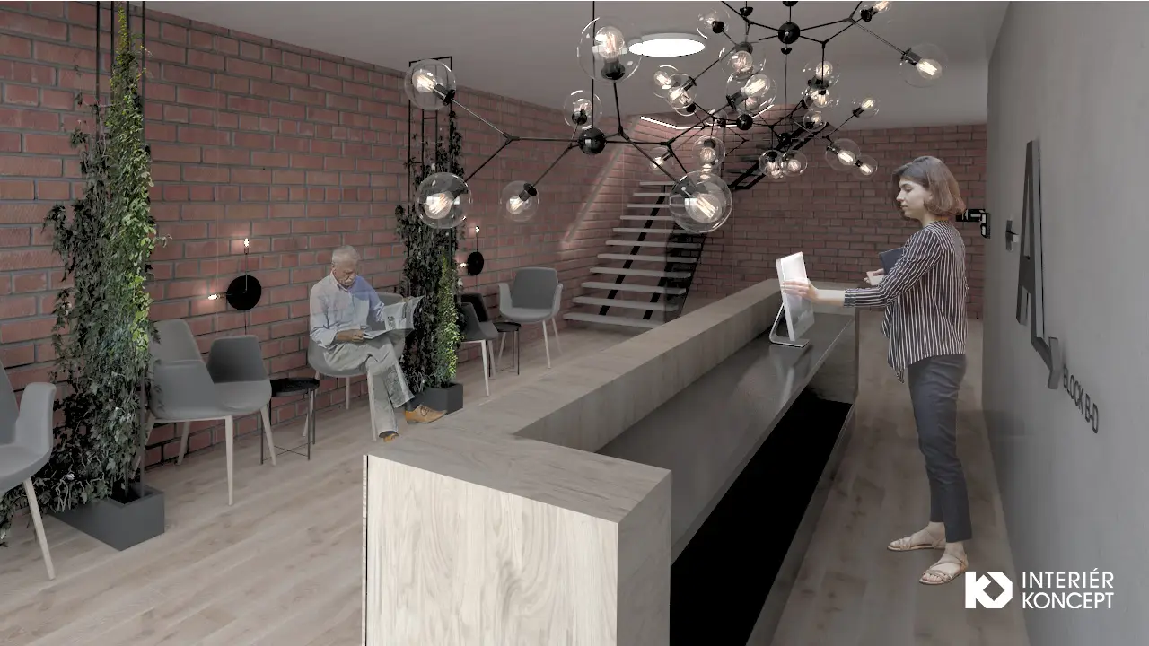 Vstupní prostor ve tvaru obdélníku jsme zkrátili na prostor s pohodlným sezením, kobercem a na prostor s jednacími stoly s křesli. Velké prosklené plochy z průčelí lákají návštěvníky do interiéru. Závěsné kruhové osvětlení, které svým nasvícením a tvarem zdůrazňují historický strop s klenbami. Celému prostoru dominuje obložená stěna s nasvíceným logem TRIGA. Zákazník se rychle identifikuje se značkou. Prostor je vzdušný, originální a vřelý.